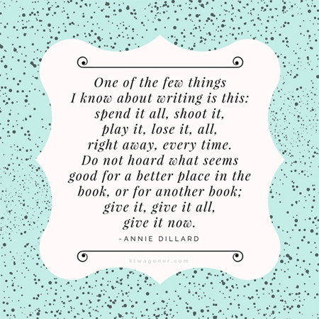 One of the few things I know about writing is this: spend it all, shoot it, play it, lose it, all, right away, every time. Do not hoard what seems good for a better place in the book, or for another book; give it, give it all, give it now. ~ Annie Dillard