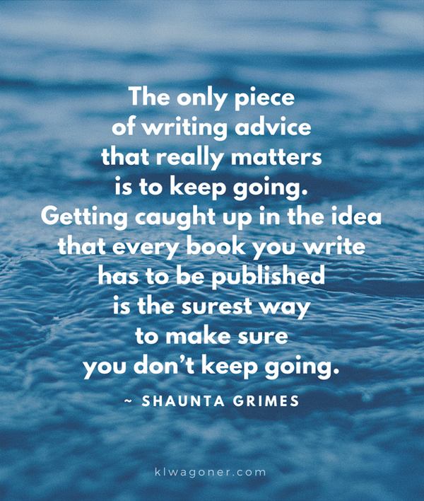 The only piece of writing advice that really matters is to keep going. Getting caught up in the idea that every book you write has to be published is the surest way to make sure you don’t keep going. ~ Shaunta Grimes