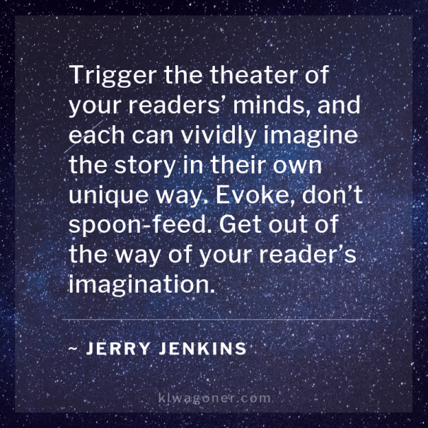 Trigger the theater of your readers’ minds, and each can vividly imagine the story in their own unique way. Evoke, don’t spoon-feed. Get out of the way of your reader’s imagination.