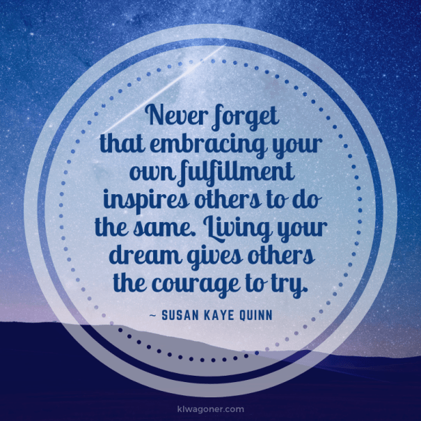 Never forget that embracing your own fulfillment inspires others to do the same. Living your dream gives others the courage to try. ~ Susan Kaye Quinn