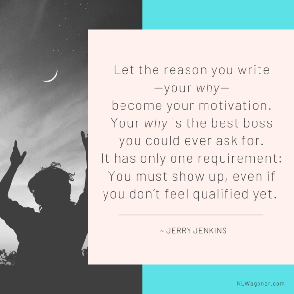 Let the reason you write—your why—become your motivation. Your why is the best boss you could ever ask for. It has only one requirement: You must show up, even if you don’t feel qualified yet. ~ Jerry Jenkins