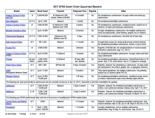 ♦ 2017 SFWA Short Story Qualifying Markets ♦ I compiled a list of short story (adult) markets that qualify for author membership eligibility in Science Fiction and Fantasy Writers of America (SFWA). Click HERE for the pdf version (updated July 19, 2017).